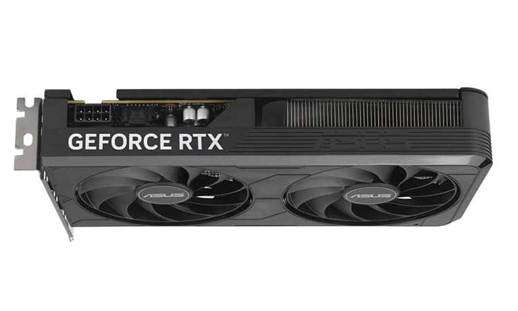 Par rapport au modèle Dual initial, la carte affiche un design beaucoup plus simple avec un carénage plastique bien plus basique que celui de la carte d’origine. Mais, ce que l’œil avisé remarquera, c’est que le slot PCIe, habituellement un x16 physique, a été raccourci en x8 afin de correspondre à l’interface de la carte graphique qui bénéficie d’un PCIe 5.0 x8.