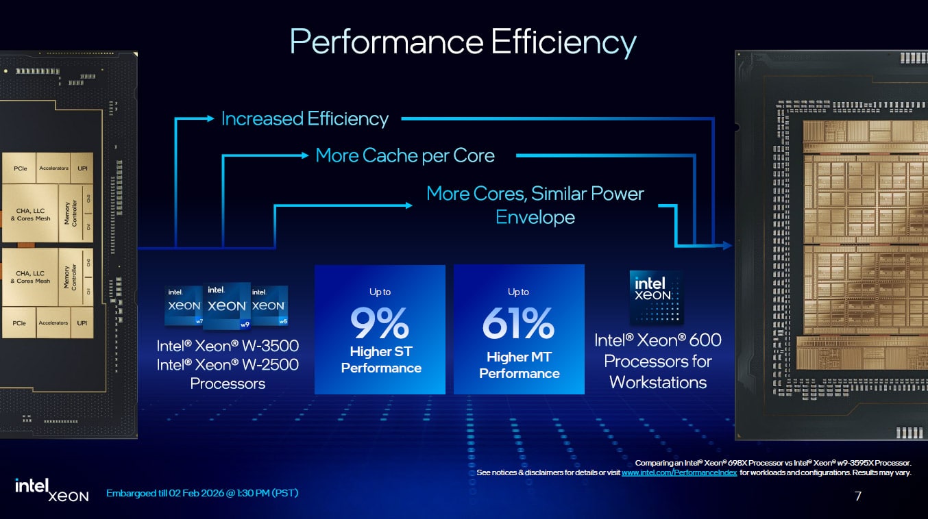 En juillet dernier, nous avions eu l’opportunité de passer en revue les Threadripper 9980X (64 cœurs) et 9970X (32 cœurs). C’est au tour d’Intel d’annoncer l’arrivée de sa gamme de Xeon 600 à destination des stations de travail, avec comme fleuron de la série, le Xeon 698X et ses 86 cœurs. Du côté des bleus, notre dernier test d’une station de travail concernait le Xeon 3495X et l’ASUS Pro W790E-Sage SE. Intel a d’ailleurs comparé les deux générations en annonçant un gain au niveau de l’efficacité énergétique et surtout pour les performances en IA.