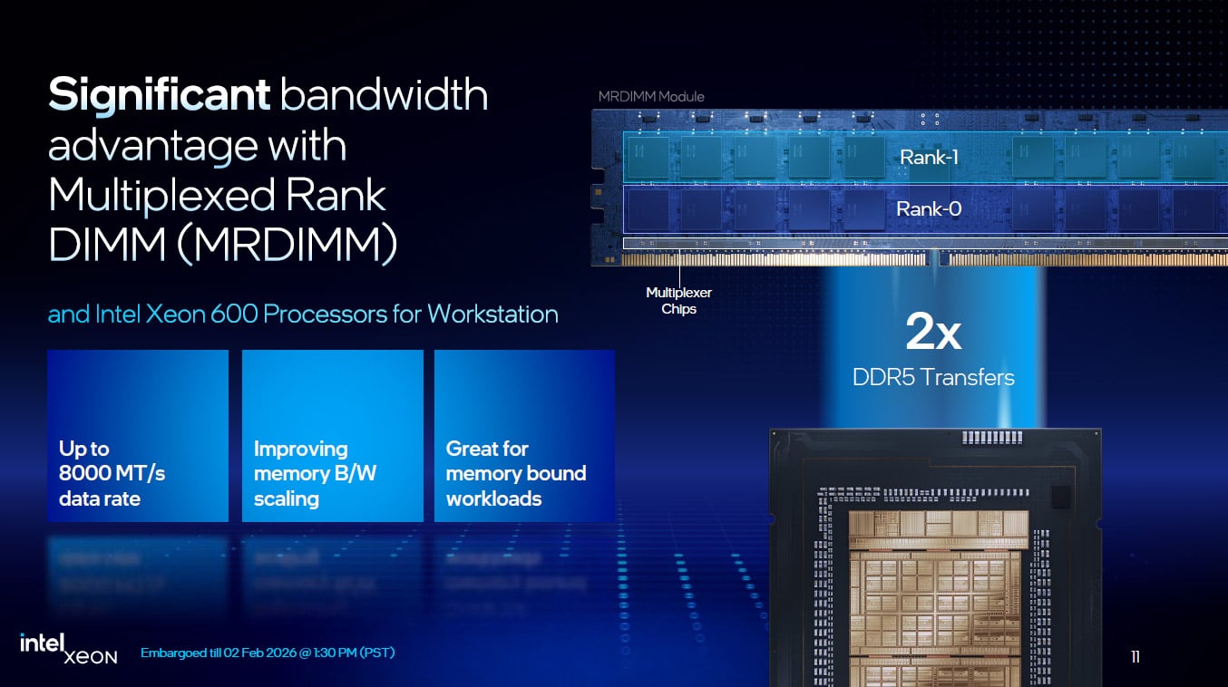 Ci-dessus, la liste des différents processeurs Xeon 600 lancés par Intel. Débutons avec le haut de la liste et les CPU disposant du suffixe « X » signifiant que le coefficient multiplicateur est débloqué afin de faciliter l’overclocking. Vous retrouvez aussi l’indication concernant la fréquence Boost ainsi que celle, lorsque l’ensemble des cœurs sont sollicités. Petite particularité de ces six modèles, c’est le support de la MRDIMM jusqu’à 8000 MT/s.