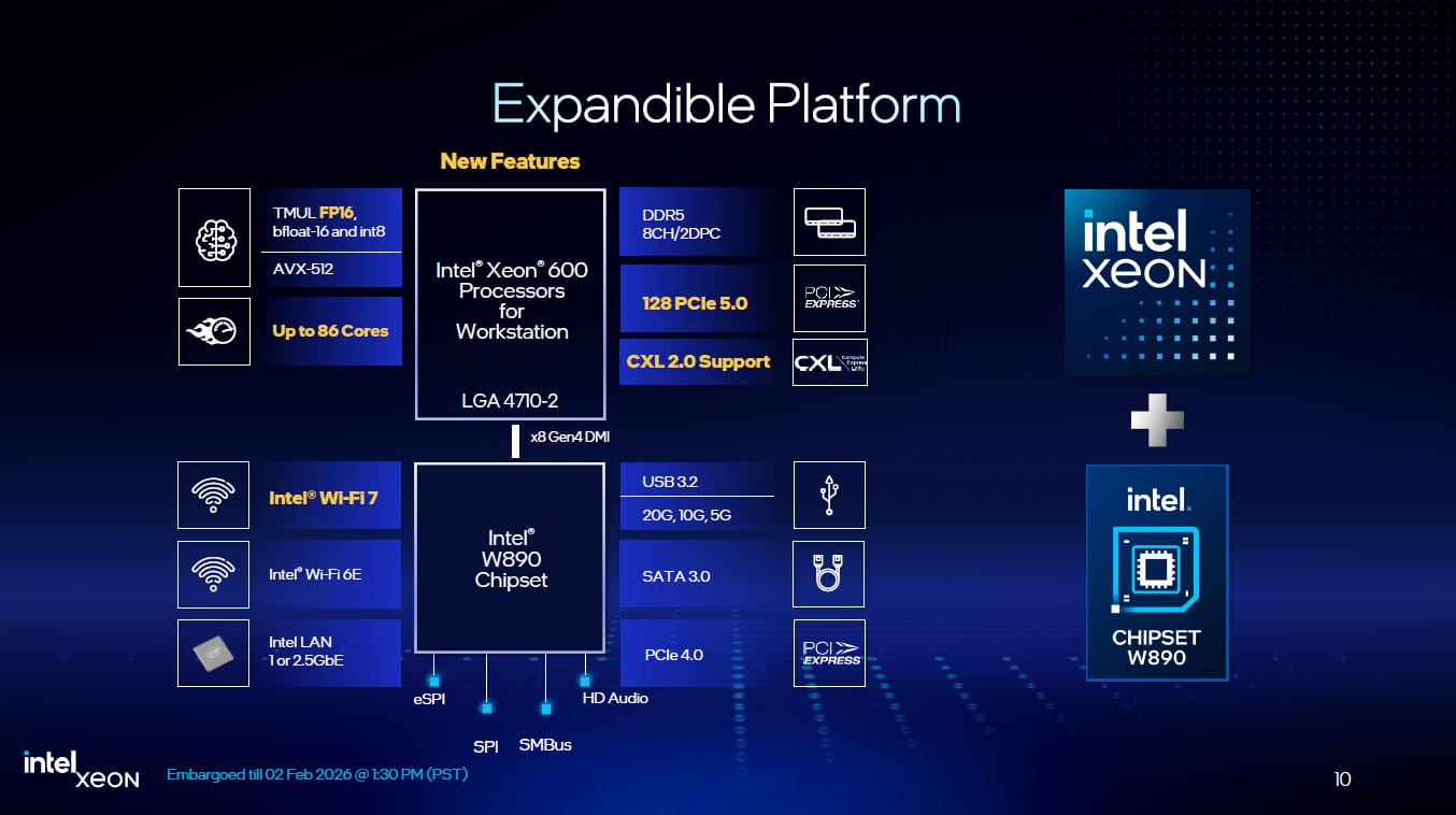 Comme c’est souvent son habitude qui dit nouveaux processeurs dit nouveau chipset. Intel dévoile donc son chipset W890 qui s’accompagne du socket LGA4710-2 afin d’accueillir ces Xeon 600. La nouveauté majeure, face au chipset W790 que nous avions testé, c’est la prise en charge du WiFi 7.
