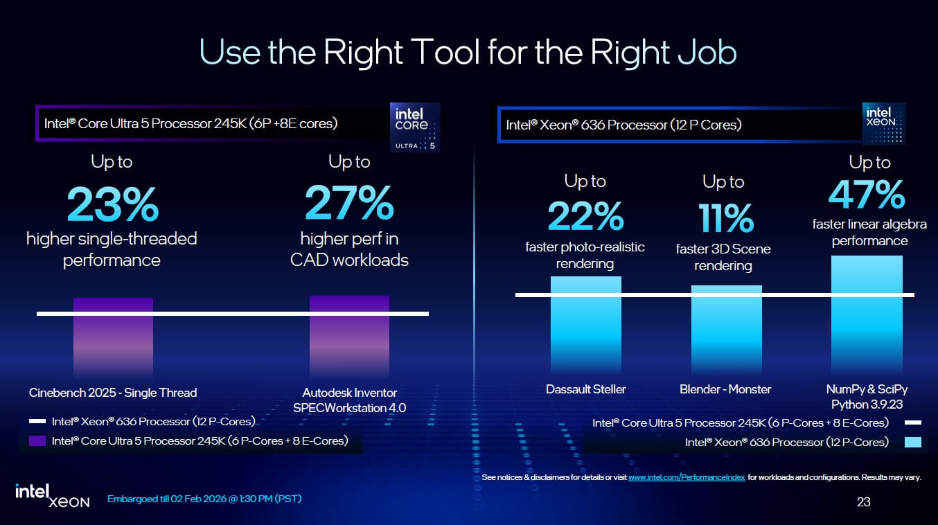 Durant le point téléphonique que nous avons suivi, Intel a tenu à remettre l’accent sur l’intérêt de ses différentes plateformes. Ils ont opposé le processeur Intel Core Ultra 5 245K (6P-Core +8E-Core) à l’Intel Xeon 636 (12P-Core). Le principe est de bien faire comprendre au public que chacune de ces plateformes est dédiée à une cible bien précise. Un joueur ou un créateur de jeu vidéo pourra se contenter largement d’un Intel Core Ultra 200 qu’il pourrait coupler avec le chipset W880.
