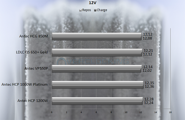 Pour finir la dernière tension fournie par l’alimentation, le 12V. Nous avons fait des relevés de mesure sur les deux câbles PCI-E (2 Rails 12V différents), et sur le 24 Pin. Les valeurs étaient quasiment identiques, dans une fourchette de 0.01V. Chargée, cette Antec HCG-850M perd 0.04V, passant de 12.12V à 12.08V. Résultat positif, aux vues de la configuration utilisée. Une 5870 ayant une consommation très proche d’une AMD HD7950 ou d’une NVidia GTX 760.