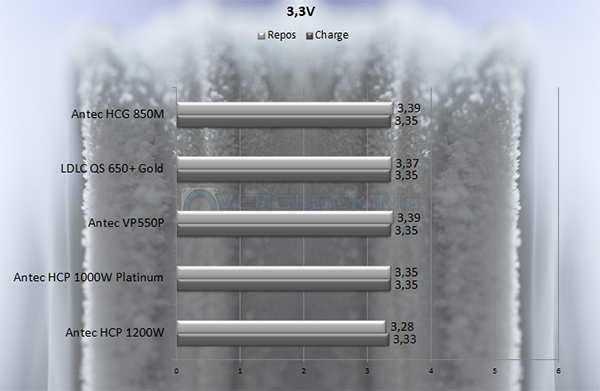 Première impression, le 3.3V est plutôt haut au repos à 3.39V, et reste plus que correct en charge avec 3.35V. La plateforme de test utilisant de façon limitée ce 3.3V (4 barrettes mémoire et 1 HDD), cette chute de 0.04V est plutôt légère. Avec une clientèle orientée Gamer, cette Antec HCG-850M fait son travail d’une bonne façon.