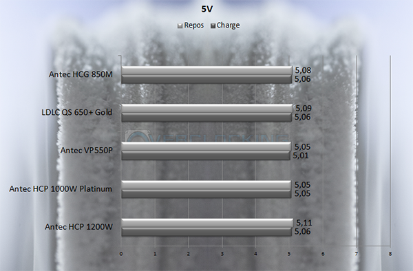 Concernant le 5V, cette Antec reste une des alimentations les plus stables de ce test, juste derrière la HCP 1000W Platinum. Belle prouesse donc avec un delta repos/charge de seulement 0.02V. Nous avons branché sur les ports USB de la configuration de test des chargeurs rapides pour smartphone (consommation de 3A donc 15W), et la tension n’a pas chuté davantage. Bonne nouvelle donc.