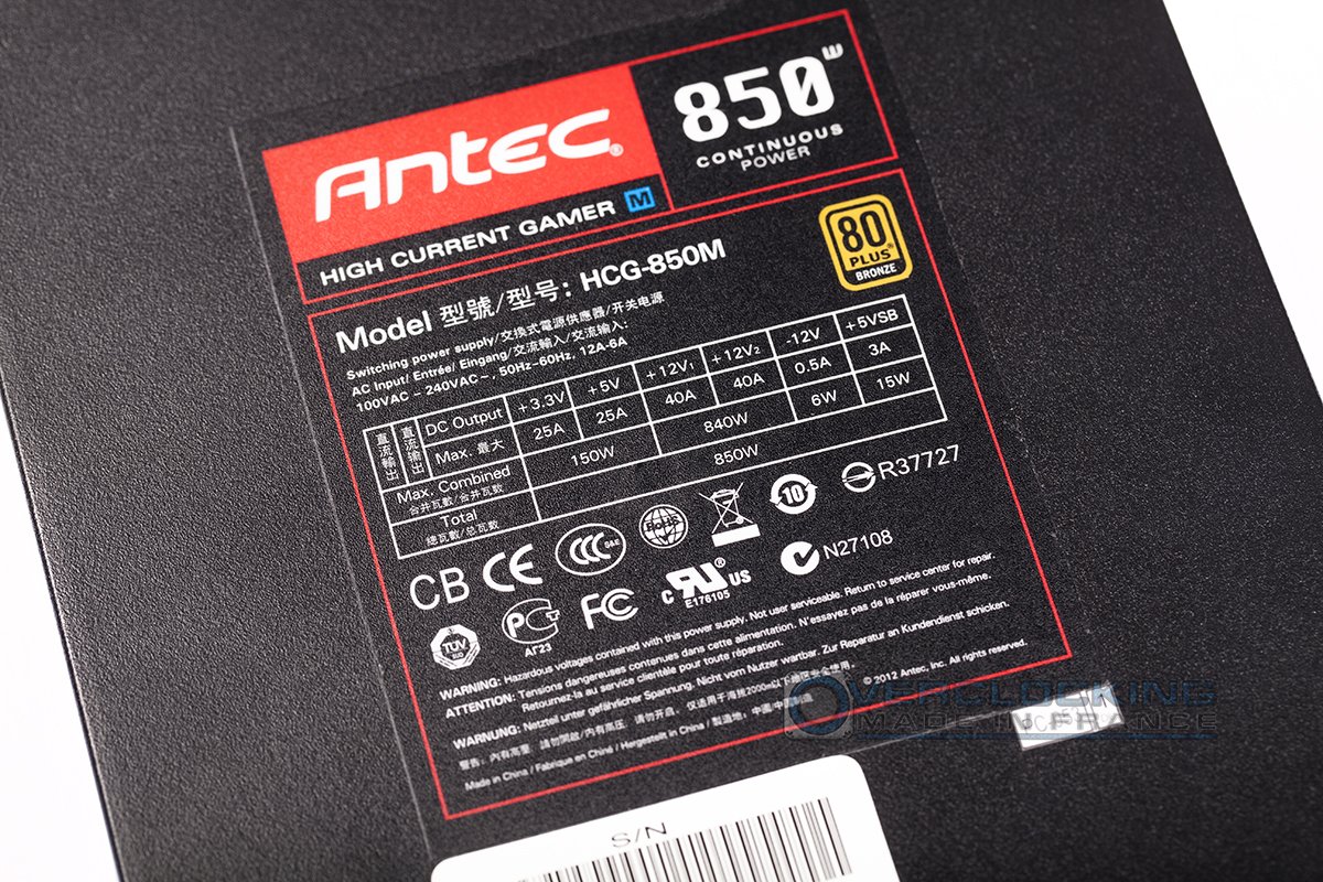 Les photos parleront d’elle-même, elle a la classe cette Antec HCG-850M avec son ventilateur équipé d’une LED. L’interrupteur aurait pu être placé au dos de l’alimentation, aux cotés de la prise 220V et de son interrupteur ON/OFF, mais Antec en a décidé autrement, dommage. Il faudra ouvrir le boitier si l’on veut l’éteindre.