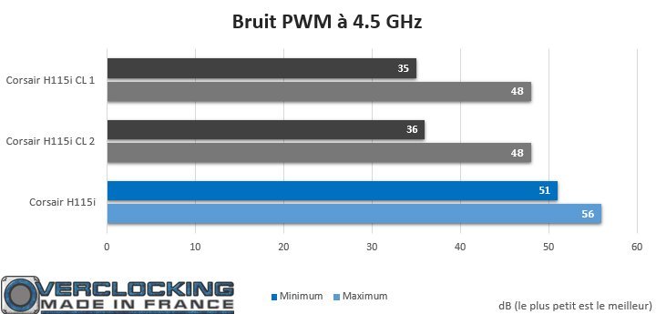 Notre but ici étant de trouver un équilibre entre bruit et températures. Nous avons effectué deux séries de relevés, une avec la pompe en mode « Silencieuse », noté Corsair H115i CL 1 et une seconde avec la pompe en mode « Performances » noté Corsair H115i CL 2. Les relevés ont été effectués avec une fréquence de 4.5 GHz.