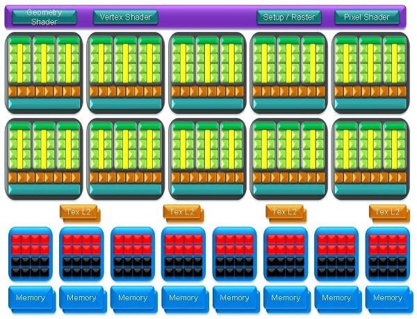Du changement également chez les ROP. Le est tout passé de 6 à 8 groupes de 4 ROP portant ainsi le nombre d’unités à 32 (16 sur les G92 et 24 aux G80). Cette augmentation du nombre de groupe de ROP rajoute bien entendu 2 contrôleurs G-DDR3 64 bits supplémentaires, ce qui fait que la largeur de bus total atteint la somme impressionnante de 512 bits.