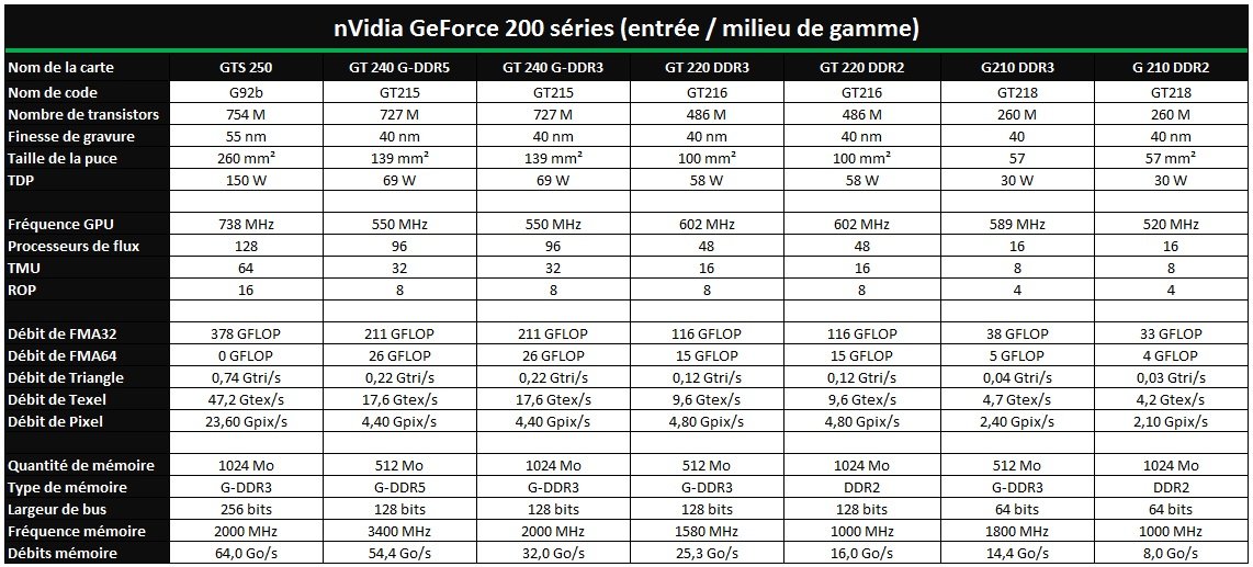 Il s’agit encore de l’architecture « TESLA », mais sous sa version 2.0. Notez qu’à partir de ce moment, Nvidia appelle ses GPU de la manière suivante : G pour Geforce, T pour Tesla, la centaine/dizaine pour la génération de l’architecture, et les chiffre suivants pour les déclinaisons. Plus le dernier chiffre est petit, plus le GPU est gros (paradoxal mais cela a sa logique). Ainsi le GT200 est plus gros que le GT214 qui est lui-même plus gros que le GT216.