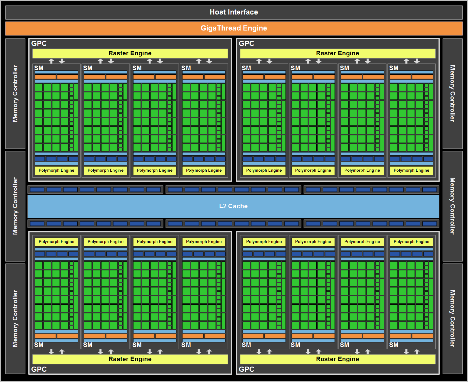 Tous les GPC sont reliés à mémoire cache unique L2, tandis que le contrôleur central sera remplacé par le GigaThread Engine, qui assure le dispatch des données du système.