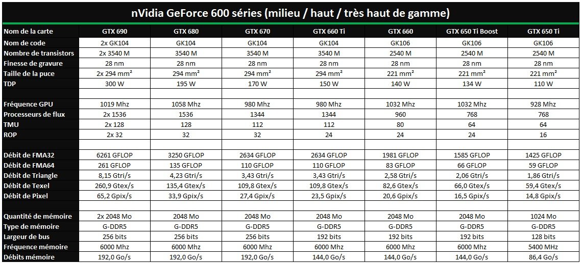 Les dérivés seront les GTX 670 qui auront 1 SMX de moins, et la GTX 660 Ti avec son bus rabaissé à 192 bits. Les autres seront les GK106 et GK107. La GTX 660 en GK106 aura par exemple 5 SMX et un bus de 192 bits.