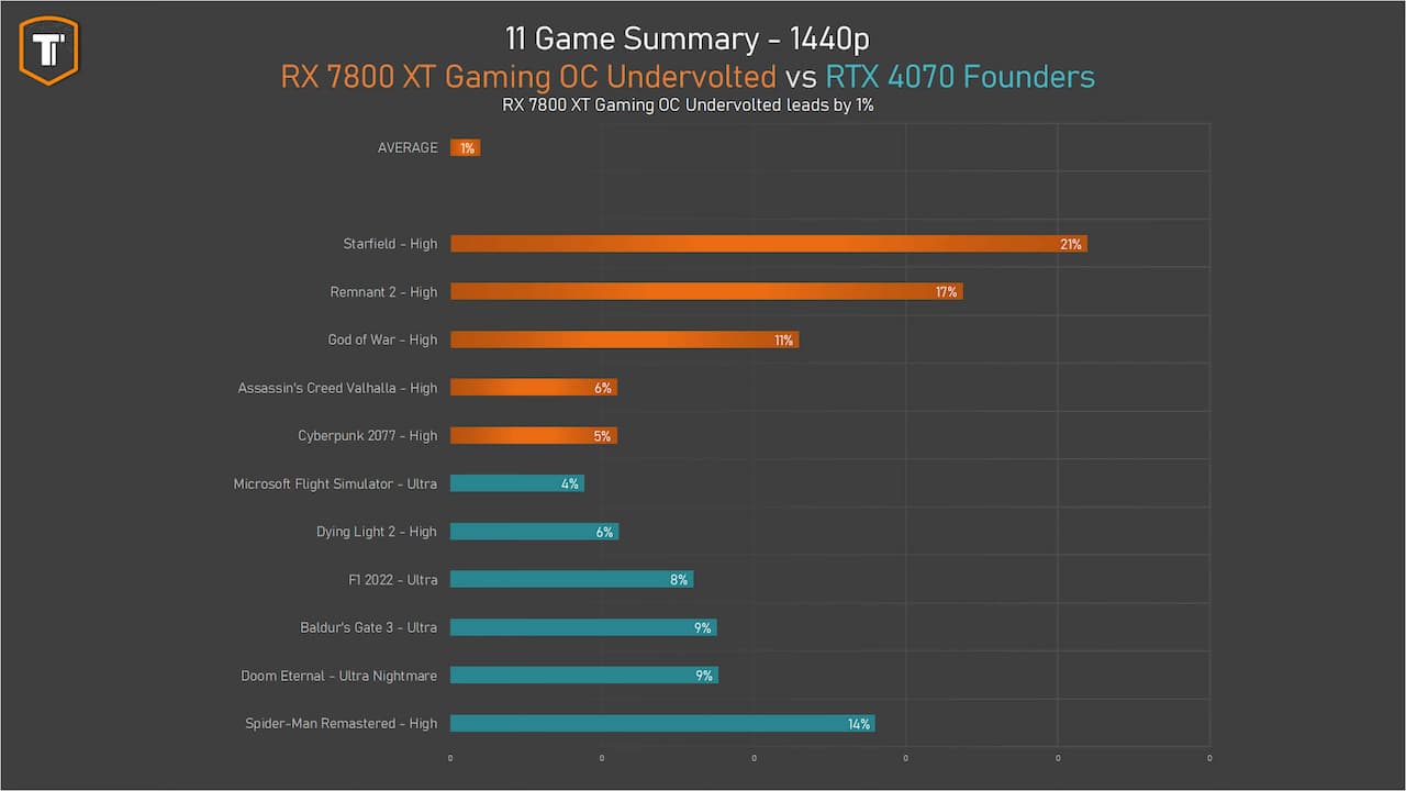 Mais ce qui est intéressant, c’est de voir l’impact sur les performances face à la RTX 4070 qui sont en moyenne 1% supérieures. Bien sûr, la carte d’AMD écrase littéralement sa rivale sur Starfield (+21%) tandis qu’elle se prend un retour de bâton sur Spider-Man (-14%). À noter que les deux cartes affichent une conso similaire : autour des 200W.