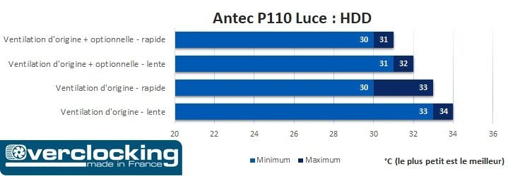 Bien que peu bruyant, et ce, quel que soit le régime de ventilation, les deux ventilateurs installés de base ne font pas de miracle. Nous avons observé des gains en ajoutant nos ventilateurs dans le haut. Un renforcement de la ventilation permettra de tirer les températures vers le bas.