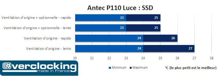 Notre SSD quant à lui semble apprécier l’augmentation de la vitesse des ventilateurs d’origines, enfin, relativisons, il est question d’une baisse de 1°C. Après avoir monté les Riing dans le haut, on perdra encore un degré en charge, quelle que soit leur vitesse.