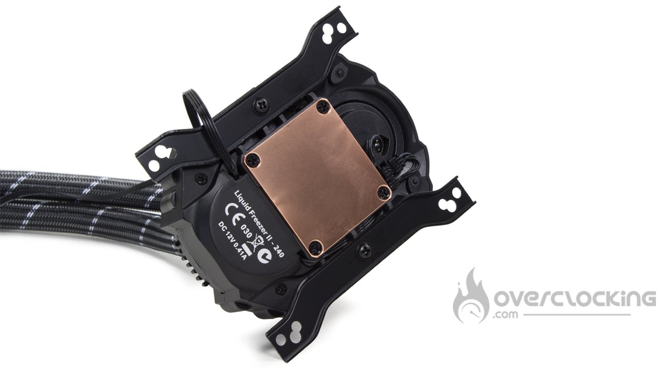 Le montage se poursuit en installant les entretoises aux extrémités du socket et on finit par déposer la pompe sur le processeur. Normalement, le montage se termine en vissant la pompe sur les entretoises à l’aide d’écrous à main.