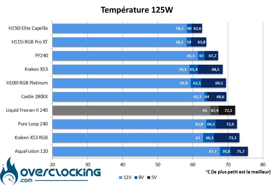Enfin, nous terminons avec notre profil 125W. Ici le dégagement thermique est plus important, voyons comment s’en sortent nos coolings !