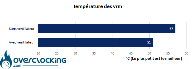 Lorsque l’on libère le petit moulin, ce dernier commence à travailler. Comme on peut le voir, lorsqu’il fonctionne à plein régime, ce dernier fait perdre 6°C sur les VRM de notre carte mère. Un gain toujours intéressant à saisir, surtout quant on sait que ce dernier saura se montrer discret, même à fond.