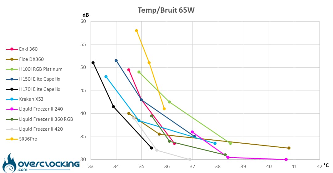 En 65W, on peut voir que notre exemplaire du jour est à l’aise et domine la concurrence, mais pas de manière significative. En effet, le Kraken X53 rivalise dans ses régimes les plus élevés quand le Liquid Freezer II 420 prend la relève à haute vitesse et mi-régime.