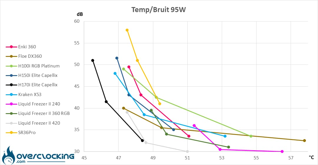 Ça y est, le H170i Elite Capellix se détache de manière significative du reste de la concurrence sur notre profil en 95W. De plus, nous remarquons une bonne puissance des ventilateurs, malgré un faible régime dans la mesure où la courbe ne s’étire pas à basse vitesse.