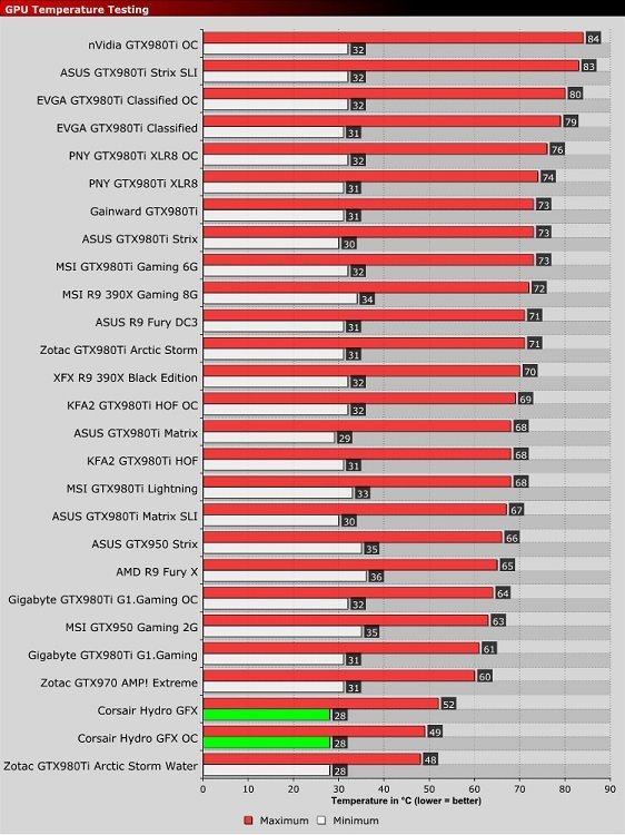 Après une petite présentation de la carte et de son refroidissement, notre confrère s’intéresse ensuite à la chauffe de la 980 Ti en réalisant quelques petits relevés. Et ici, la carte s’en sort plutôt bien ! En effet, elle ne dépasse pas les 52°C et 49°C une fois overclocké. Au minimum, la carte arrive à 28°C dans les deux cas. Ici, le refroidissement de Corsair se place donc juste après la GTX 980 Ti de Zotac et son Arctic Storm Water et de pas grand chose ! Les températures correspondent à ce qu’avait relevé Corsair.